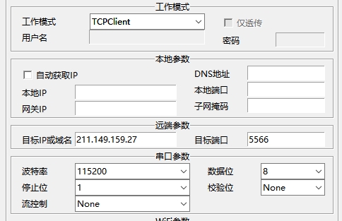 5. 做客戶端。波特率為115200 校驗數據停止為 0 8 1。串口流控制為None。工作方式為TCP Client。目標ip:自己服務器的ip,端口自己服務器開發端口,其他不用變。點擊端口2設置。
