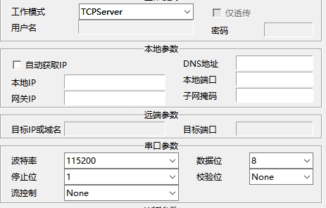 4. 看一下自己的網關做服務端開發服務器網絡端口,且不被防火墻阻攔端口,波特率為115200 校驗數據停止為 0 8 1。串口流控制為None。工作方式為TCP Server。本地端口自己設。