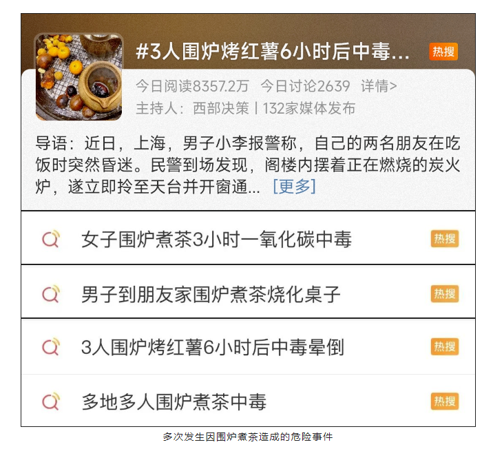不過,我們也看到圍爐煮茶已造成多地多起意外傷亡事件——一氧化碳中毒。